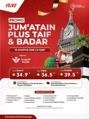 Di bulan April ini, Alhijaz Indowisata menghadirkan paket UMROH JUMATAIN DI MASJIDIL HARAM DAN MASJID NABAWI PLUS THAIF | APRIL. Dalam paket umrah ini anda akan berkesempatan melakanakan Shalat Jum'at di Masjidil Haram ataupun Masjid Nabawi. Rasakan kekhusyukan menjalanan shalat jumat di tanah haram bersama Alhijaz Indowisata.