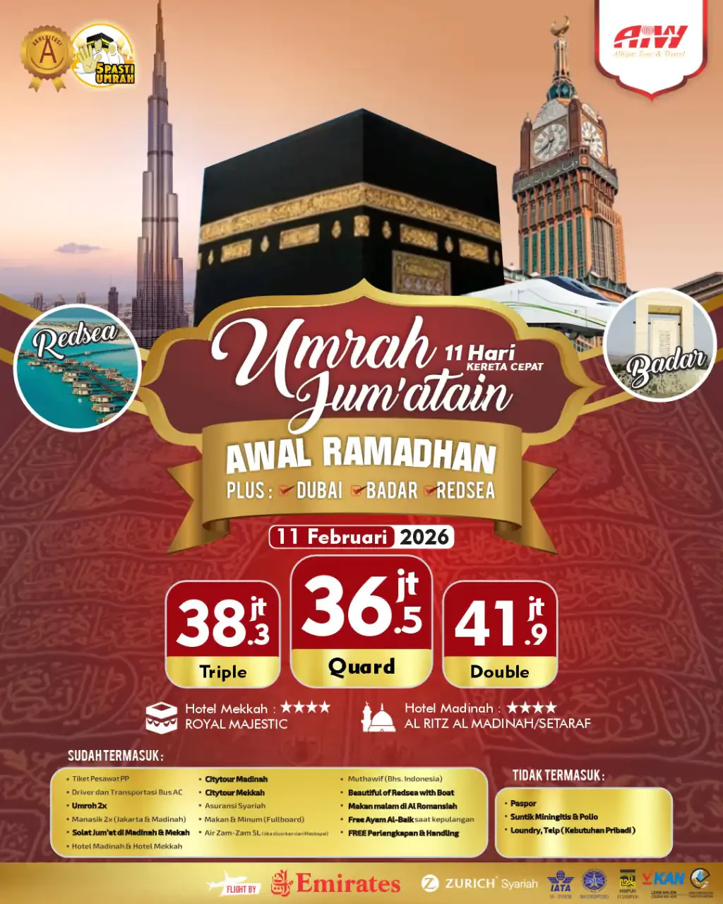 PAKET UMRAH RAMADHAN 2024. AWAL PLUS TURKI Biaya Umroh 4 orang kmr Rp. 35,9 Juta Double 4 Biaya Umroh 3 orang kmr, Rp. 37,4 Juta Triple 4.